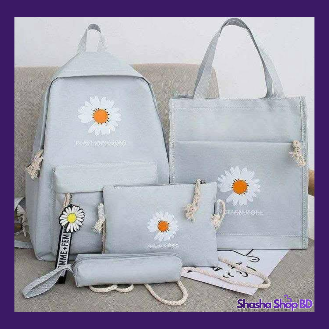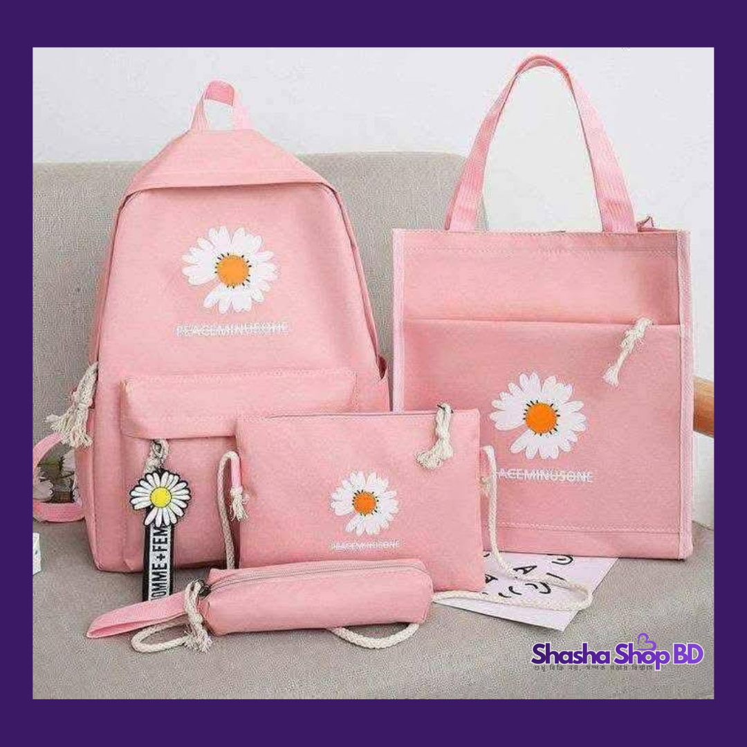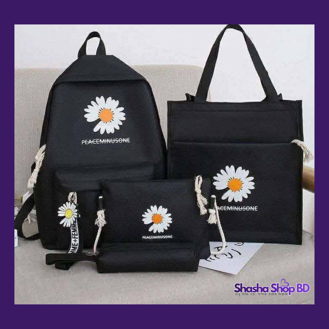 Set Includes: ৪টি পণ্যের কম্বো (ব্যাকপ্যাক, টোট ব্যাগ, ক্রস বডি ব্যাগ এবং পেন্সিল কেস)।