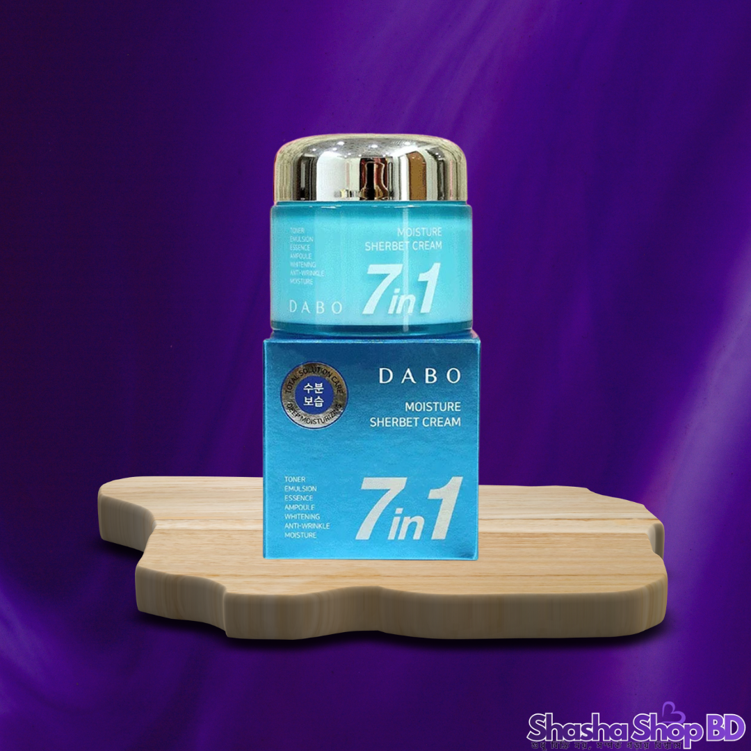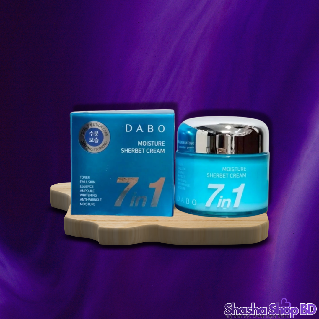 ত্বককে একইসাথে হাইড্রেটেড, উজ্জ্বল এবং সতেজ রাখতে Shasha Shop BD নিয়ে এলো দক্ষিণ কোরিয়ার জনপ্রিয় ব্র্যান্ড DABO-এর মাল্টি-ফাংশনাল 7 in 1 Moisture Sherbet Cream। এর বিশেষ শেরবেট টেক্সচার ত্বকে লাগানোর সাথে সাথেই মিশে যায় এবং কোনো আঠালো ভাব ছাড়াই ত্বককে রাখে প্রাণবন্ত।