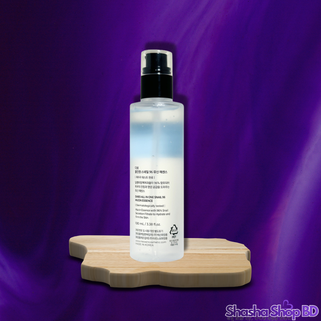 ত্বকের ড্যামেজ রিপেয়ার করতে এবং প্রাকৃতিকভাবে উজ্জ্বল ও সতেজ ভাব ফিরিয়ে আনতে Shasha Shop BD নিয়ে এলো DABO ব্র্যান্ডের অত্যন্ত কার্যকর All In One Snail 96 Mucin Essence। ৯৬% স্নেল মিউসিন সমৃদ্ধ এই এসেন্সটি আপনার ত্বকের টেক্সচার উন্নত করে এবং ভেতর থেকে স্বাস্থ্যকর উজ্জ্বলতা প্রদান করে।