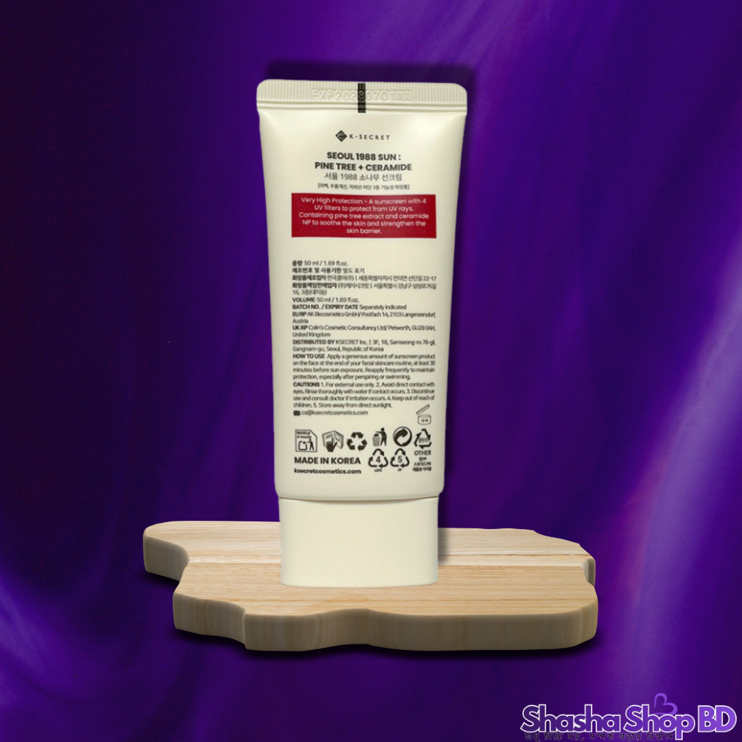 K-Secret Seoul 1988 Sun : Pine Tree + Ceramide (50ml) (SPF 50+ PA++++, Skin Barrier Care & Soothing – আপনার ত্বকের সুরক্ষায় কোরিয়ান ঐতিহ্যের আধুনিক ছোঁয়া!)