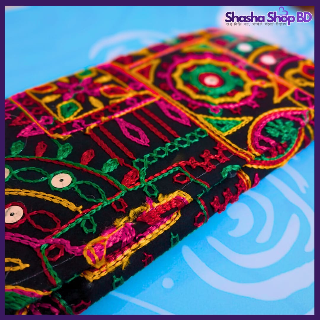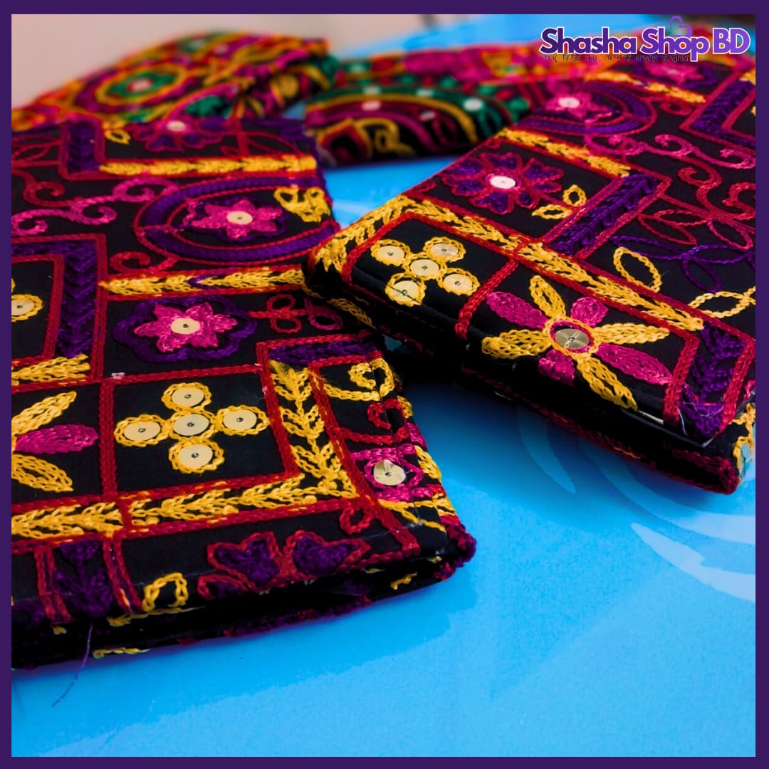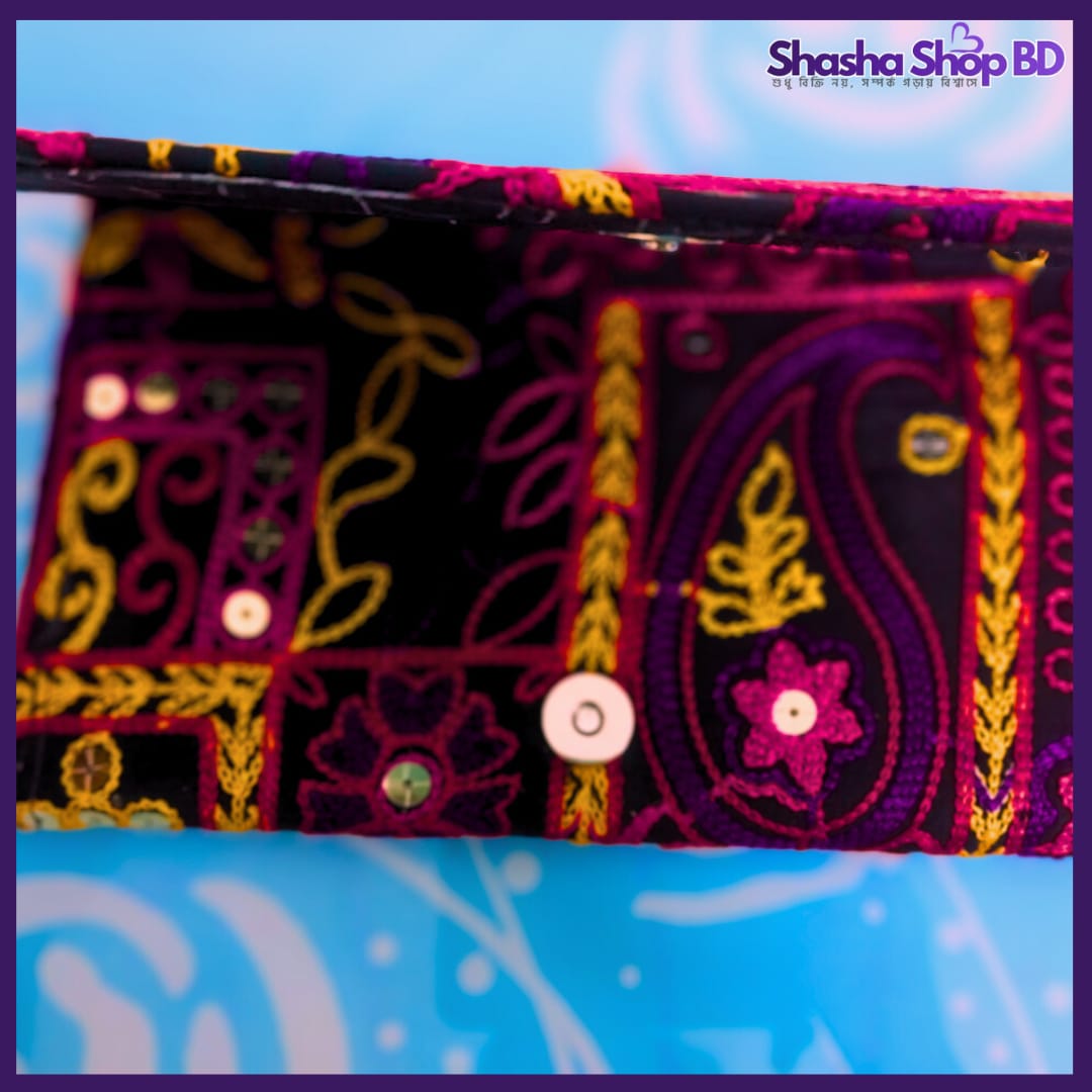 আপনার এথনিক আউটফিটকে আরও আকর্ষণীয় করে তুলতে আমরা নিয়ে এসেছি এই Exclusive Handcrafted Embroidery Purse। কালো ভেলভেট/ফেব্রিক বেসের ওপর উজ্জ্বল সুতোর কারুকাজ এবং ছোট ছোট আয়নার (Mirror work) ব্যবহার ব্যাগটিকে দিয়েছে একটি প্রিমিয়াম এবং গর্জিয়াস লুক।